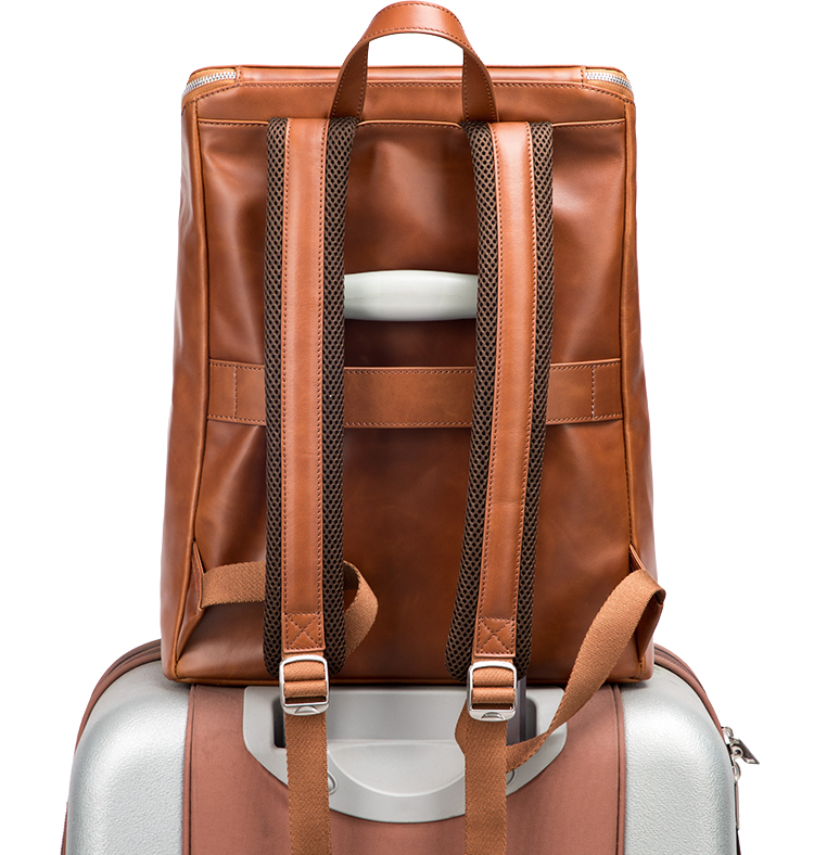 The backpack for your way to the office or a stroll in the city. It has one big compartment with small pockets for phone, cards and pens and a fixed belt the backside , which can be attached on the luggage. Easy to carry with two shoulder straps. Made out of soft vintage leather.